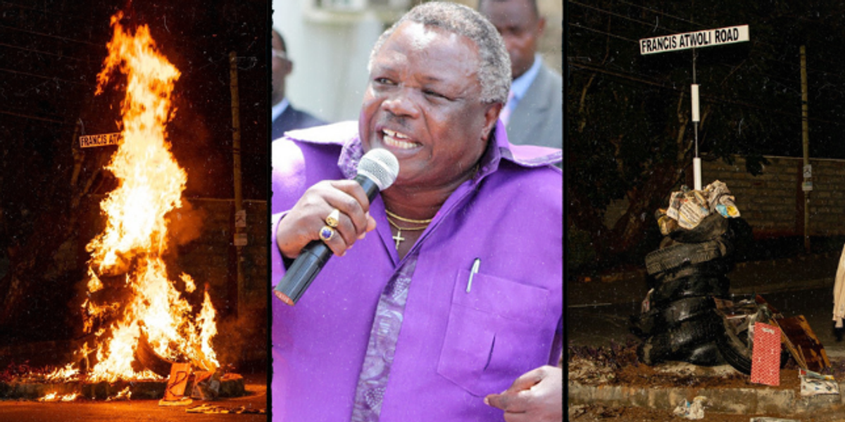 Photos seen by Pulse Live, captures the signpost bearing Atwoli’s name being set on fire by irritated Kenyans who seem to be in disagreement with Nairobi County for naming a Road after the vibrant COTU Boss.